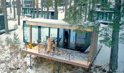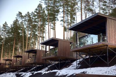 Эти "парящие дома" находятся на склоне, благодаря чему гостям открывается очень эффектный панорамный вид на реку, горы и сосны. Дом возвышается на пять метров от береговой линии и словно парит над территорией отеля.