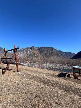 на берегу реки Чулышман, из окон можно любоваться живописными видами.