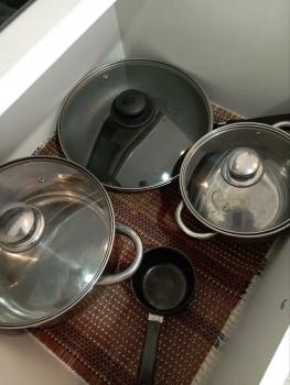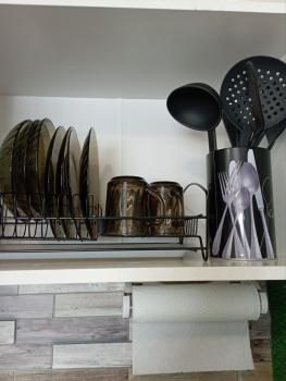 Кухня: холодильник, плита, СВЧ-печь, чайник, посуда, гарнитур, стол, посуда.