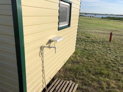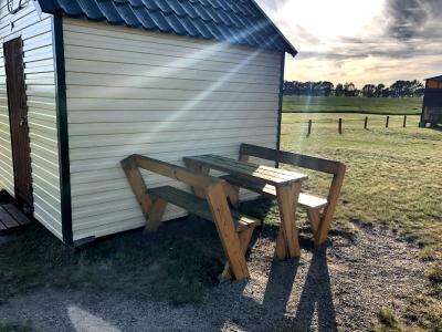 Снаружи домиков кран с холодной водой, стол и лавочки.