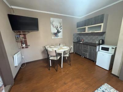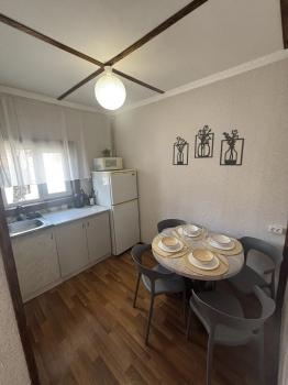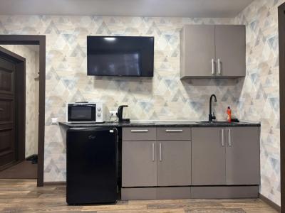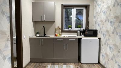 - Кухня оборудована электрической плитой и холодильником. Есть необходимый набор посуды, чайник, свч-печь.