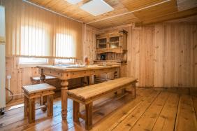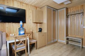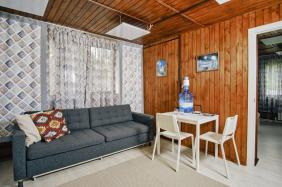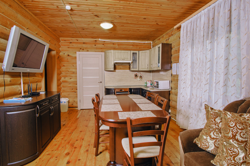 - Коттедж №3/1. Кедровый двухэтажный коттедж с отдельным входом. Площадь 72 кв. м. Большой холл, угловой диван, телевизор, оборудованная кухня (кухонный гарнитур, мебель, холодильник, плита, духовой шкаф, микроволновая печь, электрочайник, набор посуды), обеденная зона. Три спальни: комната №1 и №2 с двуспальными кроватями, комната №3 с двумя раздельными кроватями. В спальнях есть телевизор, трюмо, шкаф. Ванная комната: WC, раковина, душевая кабина.