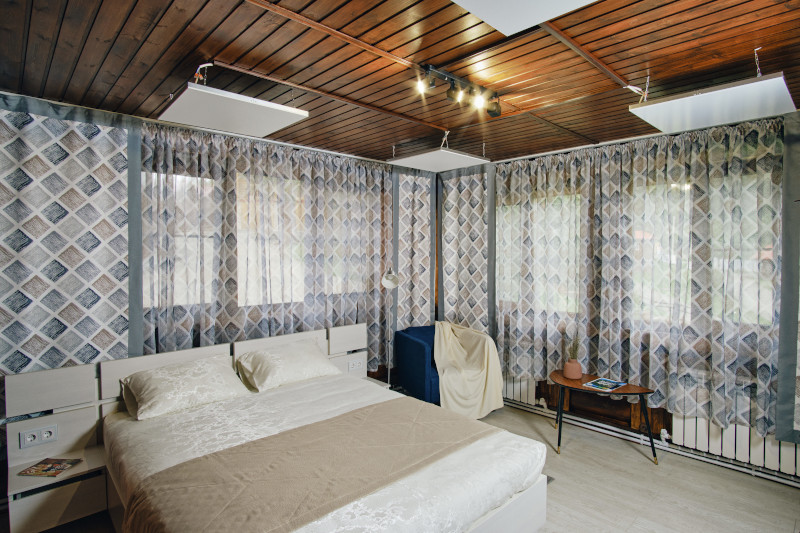 - Номер №9. Двухкомнатный угловой 4х-местный номер с тремя кроватями, 25 м2. В номере: в одной комнате 2-х спальная кровать, телевизор, холодильник, шкаф, обогреватель. В другой - 2 раздельные кровати, телевизор, шкаф, обогреватель, чайная пара. Ванная комната: WC, раковина, душевая кабина.