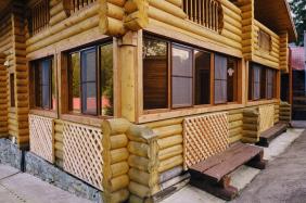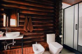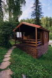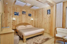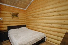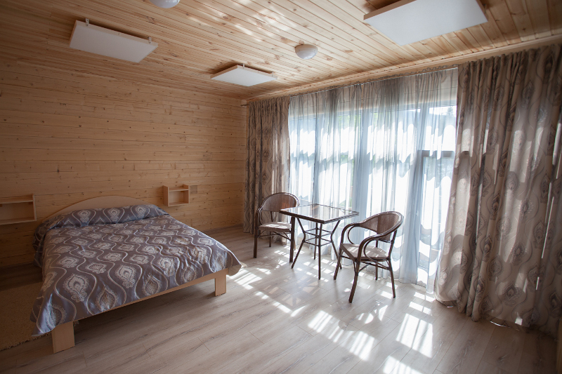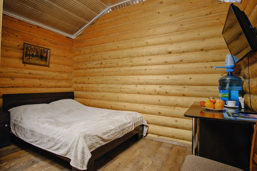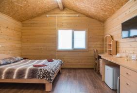 - Коттедж №2/2. Кедровый двухэтажный коттедж с отдельным входом. Площадь 26 кв. м. Две спальни, в одной (с балконом) одна двухспальная кровать, во второй две раздельные кровати, в спальнях телевизор, холодильник, шкаф. Ванная комната: WC, раковина, душевая кабина.