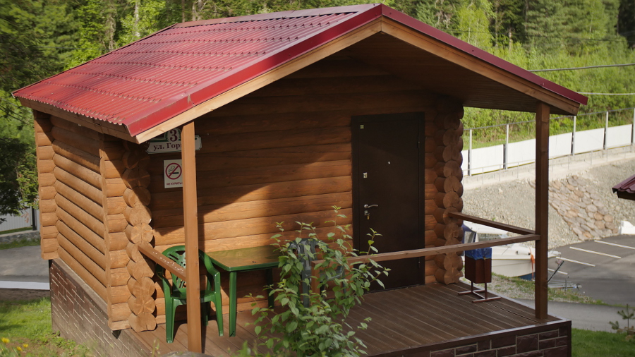 - Домики (VIP) №1-7. 2 человека + 1 доп. место. Номера улучшенной комфортности 27 м2 с панорамным окном, балконом и видом на Телецкое озеро. В номере: двуспальная кровать, кресло-кровать, телевизор, холодильник, шкаф, трюмо, чайный столик, электрочайник, чайная пара. Ванная комната: WC, раковина, душевая кабина.