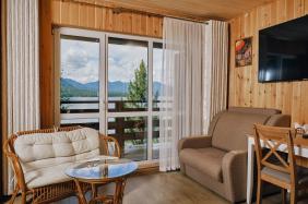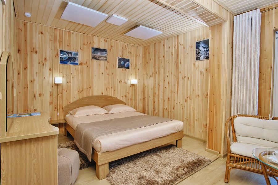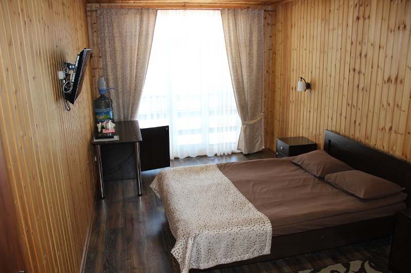 - Домик (VIP) 7/1. 2 человека + 1 доп. место. Номер улучшенной комфортности 30 м2 с панорамным окном, балконом и видом на Телецкое озеро. В номере: двуспальная кровать, кресло-кровать, телевизор, холодильник, шкаф, трюмо, чайный столик, электрочайник, чайная пара. Ванная комната: WC, раковина, душевая кабина.