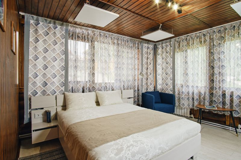- Домики №9,10 ул. Кедровая. Площадь 20 кв. м. Номера улучшенной комфортности с панорамным окном, балконом и видом во двор. В номере: двуспальная кровать, телевизор, холодильник, шкаф, чайный столик, электрочайник, чайная пара. Ванная комната: WC, раковина, душевая кабина.