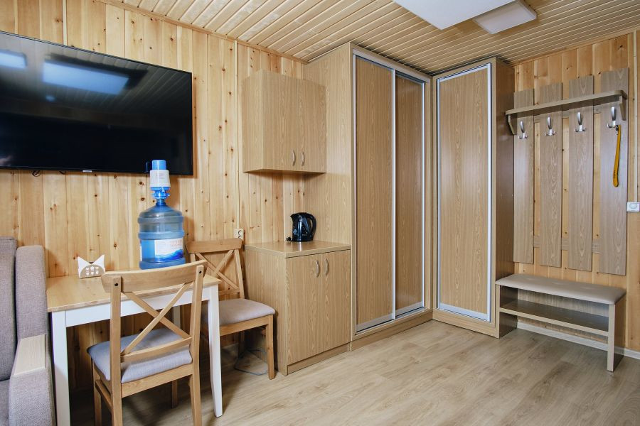 - Домик (VIP) №8-18. 2 человека + 1 доп. место. Номера улучшенной комфортности с панорамным окном и видом на Телецкое озеро 25 м2. В номере: двуспальная кровать, кресло-кровать, телевизор, холодильник, шкаф, трюмо, чайный столик, электрочайник, чайная пара. Ванная комната: WC, раковина, душевая кабина.