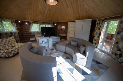 - Коттедж №2/1. Кедровый двухэтажный коттедж с отдельным входом. Площадь 65 кв. м. Большой холл, угловой диван, телевизор, оборудованная кухня (кухонный гарнитур, мебель, холодильник, плита, духовой шкаф, микроволновая печь, электрочайник, набор посуды), обеденная зона. Три спальни: в одной двуспальная кровать, во второй 2 раздельные кровати, в третьей двуспальная и односпальная кровати. Две ванные комнаты: WC, раковина, душевая кабина. В спальнях есть телевизор, трюмо, шкаф.