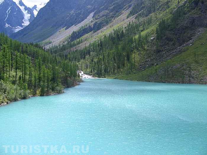 Нижнее Шавлинское озеро самое большое и красивое из группы озер: ~1,5 км в длину и 500 м в ширину. Расположено на высоте 1983 м. Имеет крутой каменистый западный берег и пологий восточный, на котором в уютном лиственничном с вкраплениями кедра лесу множество мест, удобных для стоянок. Это основное место паломничества туристов. Завораживающе красивое зеркало озера с молочно-бирюзовой водой, в котором любуются своим великолепием ослепительные снежные вершины Мечта, Сказка и Красавица никого не оставляет равнодушным.