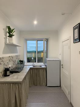 В номере: двуспальная кровать, два кресла-кровати, топпер, тумбочка, стеллаж, телевизор, WC + душевая кабина, мини-кухня (мультиварка, микроволновая печь, мини-холодильник, электрический чайник, набор посуды). Современная, комфортная ванная комната с тёплым полом (фен, полотенцесушитель, шампунь, кондиционер, полотенца).