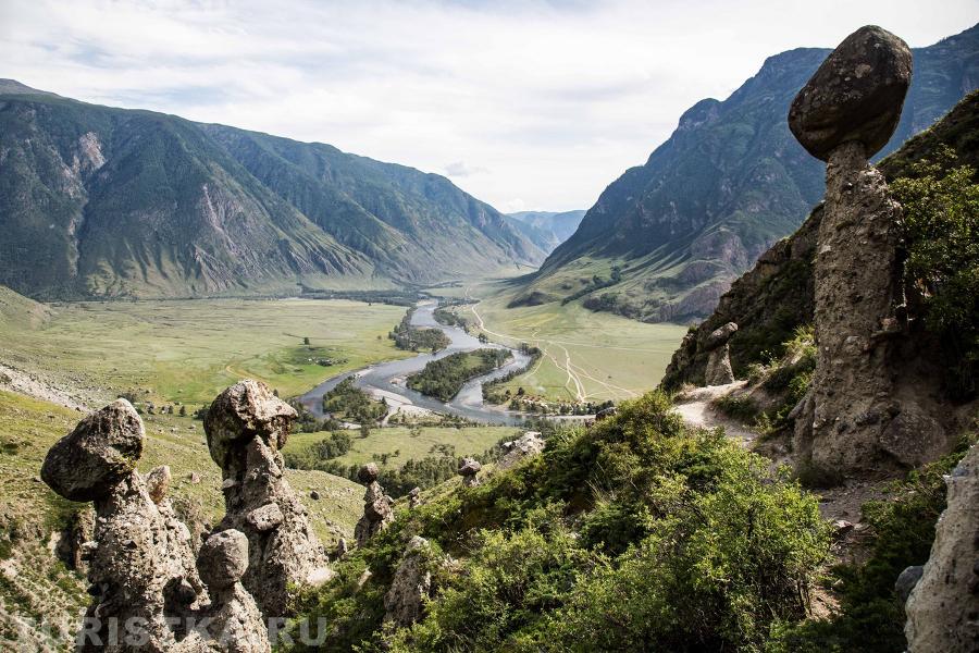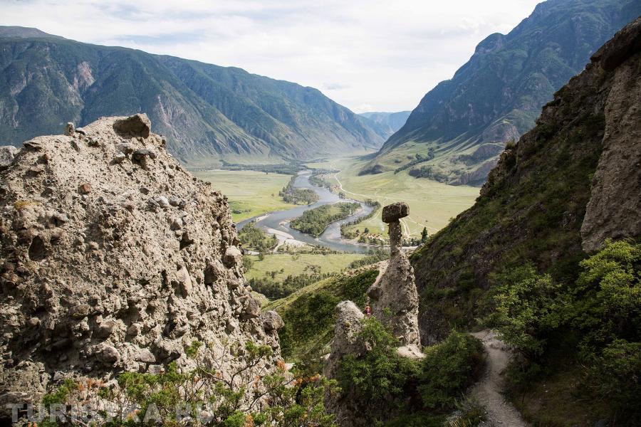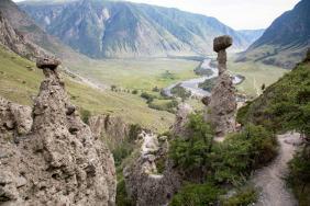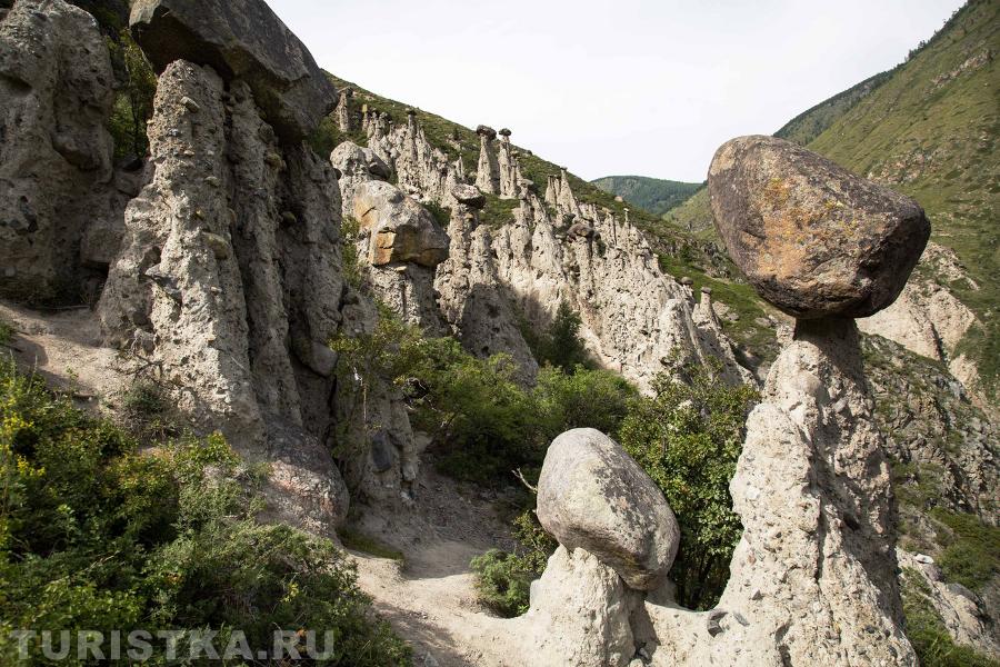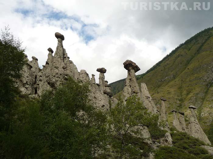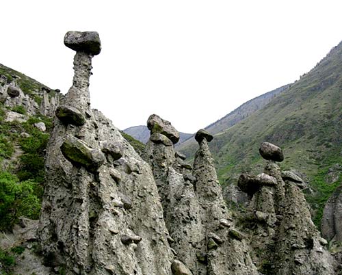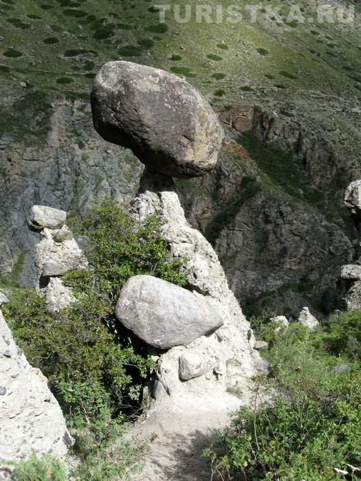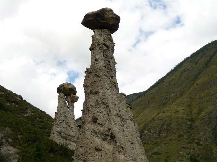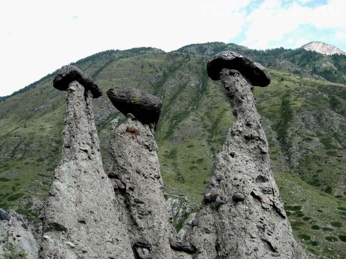 Здесь, в ущелье Карасу, где протекает одноименный приток Чулышмана, находятся каменные грибы необычные формы рельефа, образовавшиеся в результате избирательного вымывания (по-научному денудации) неоднородных горных пород. Выросли эти грибы примерно так: глыба из прочной породы служила своеобразным зонтиком для своего основания. Более мягкая порода вокруг основания размывалась осадками, а стебель рос, рос, рос... И так много-много лет.