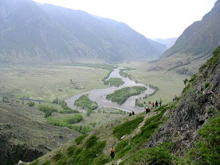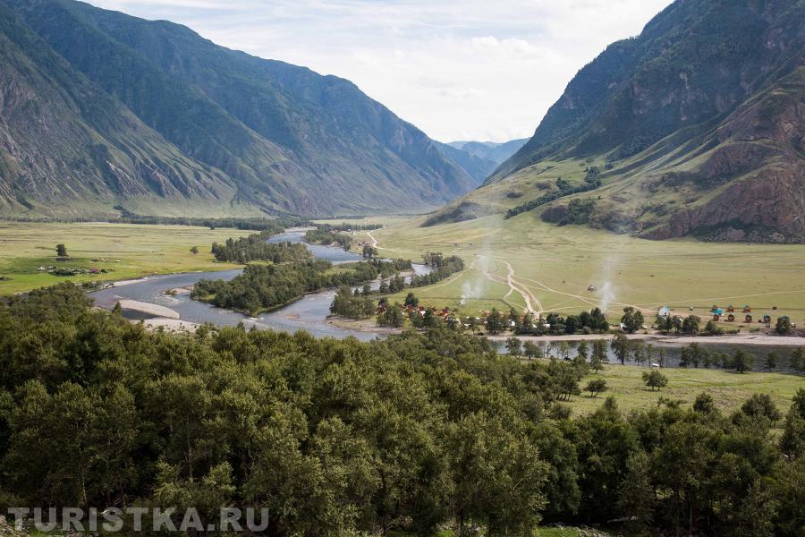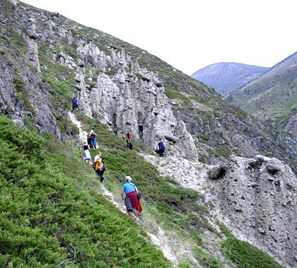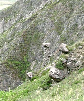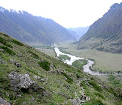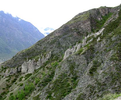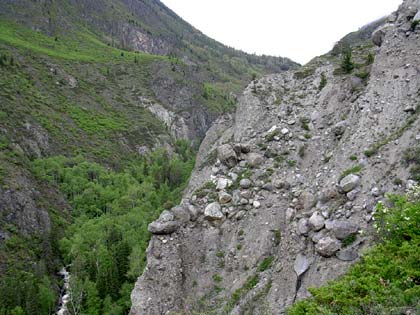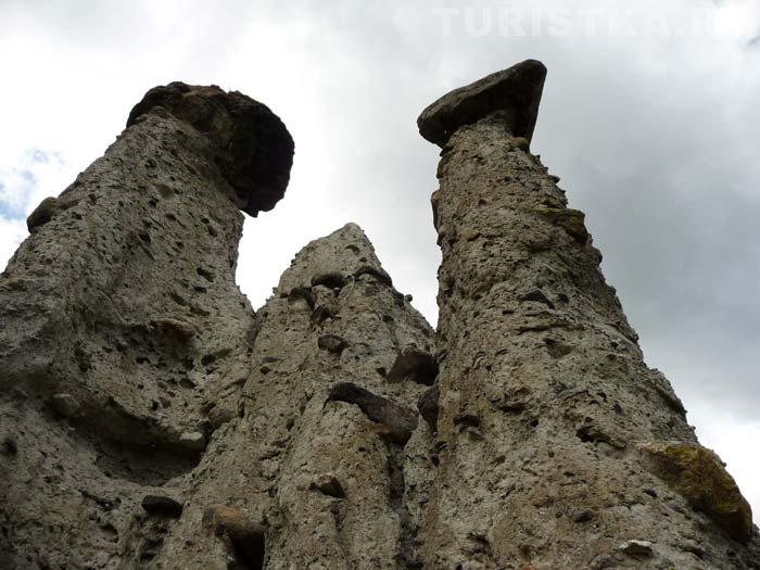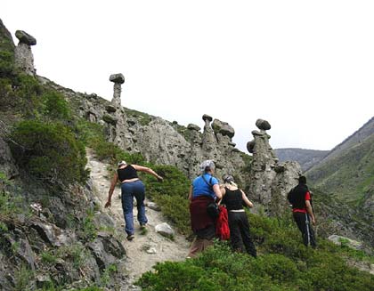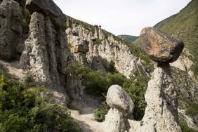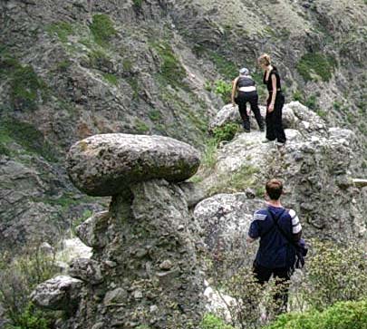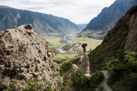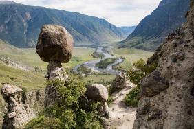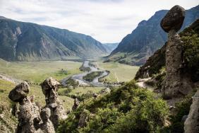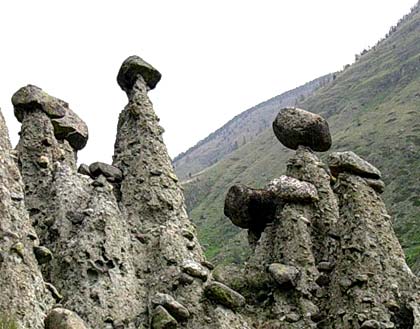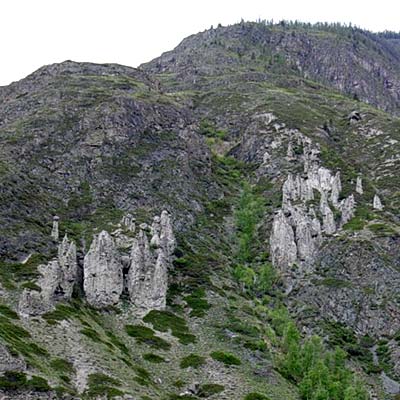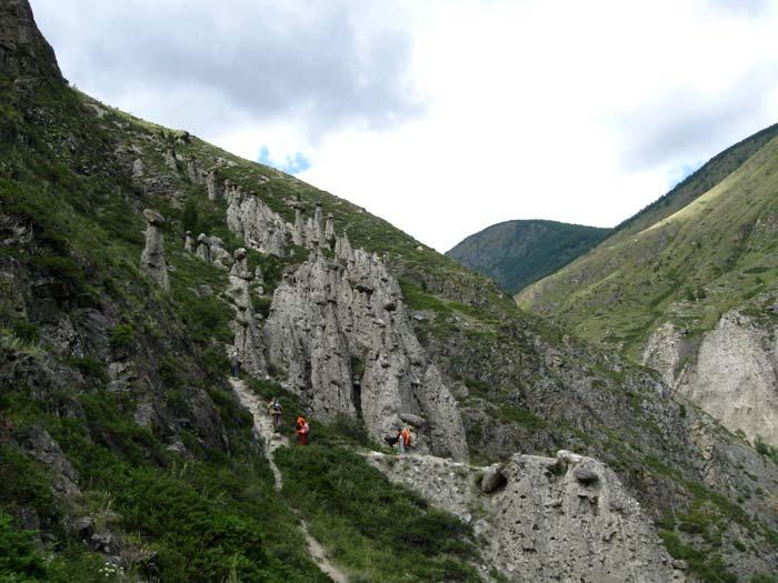 Здесь, в ущелье Карасу, где протекает одноименный приток Чулышмана, находятся каменные грибы необычные формы рельефа, образовавшиеся в результате избирательного вымывания (по-научному денудации) неоднородных горных пород. Выросли эти грибы примерно так: глыба из прочной породы служила своеобразным зонтиком для своего основания. Более мягкая порода вокруг основания размывалась осадками, а стебель рос, рос, рос... И так много-много лет.