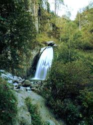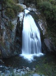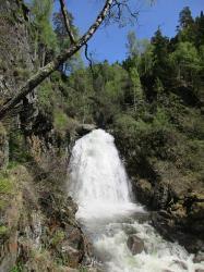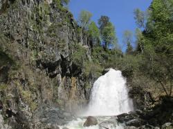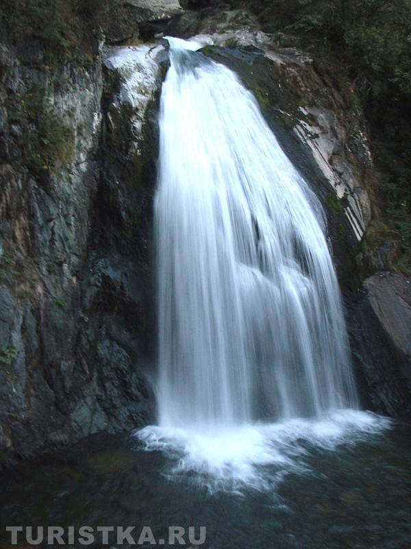 Корбу – это красивый и впечатляющий водопад на реке Большой Корбу. Река берет начало с хребта Корбу. На всем своем небольшом пути - 7,6 км, река образует маленькие водопады и затем обрушивается с высоты 12,5 метров водопадом Корбу. Так как падает вода не совсем отвесно, а по пути разбивается о камни, то образуется эффектный водяной веер. Особенно впечатляет водопад в большую воду весной и после дождей. Брызги долетают даже до обзорной площадки. Но и осенью, при малой воде водопад и ландшафт вокруг него восхитительны! Справа от водопада крутой, поросший смешанным лесом берег. Слева над водопадом возвышаются высокие отвесные скалы. Даже водопад кажется маленьким по сравнению с ними, а человек и подавно. На скалах каким то чудом зацепились и растут отдельные деревья, кусты маральника, украшающие водопад в мае.