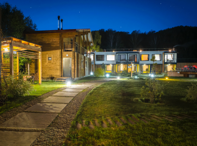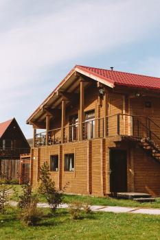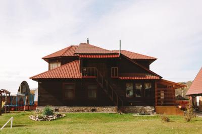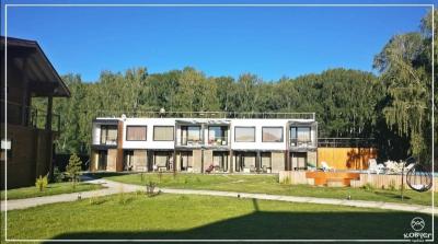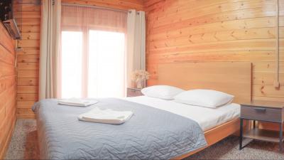 - Двухэтажный коттедж, построенный из дерева. В коттедже находятся стандартные номера (туалеты и душевые вне номера, на этаже) вместимостью 2, 3, 6, 8 гостей, везде можно поставить доп место. На цокольном этаже зал для занятий и практик, кафе-столовая на веранде, Wi-Fi в номерах.