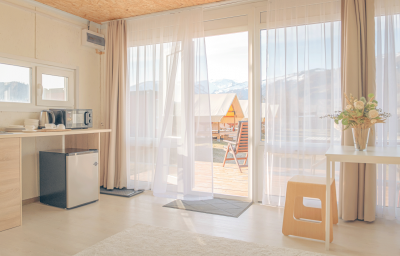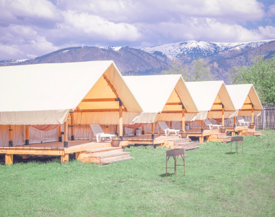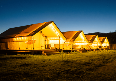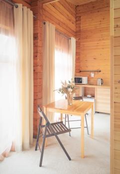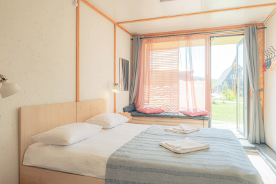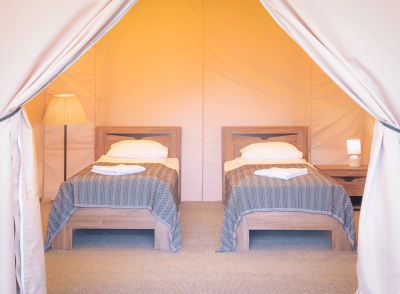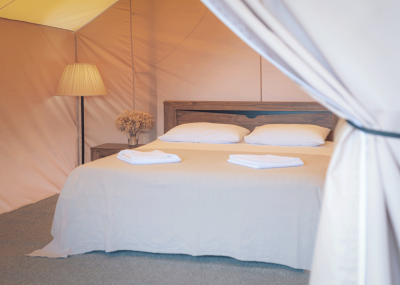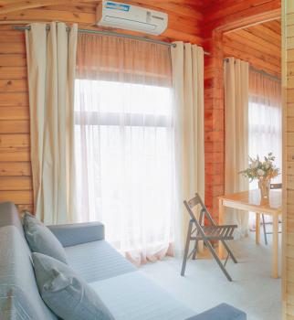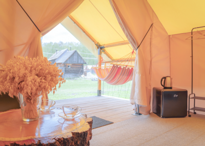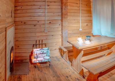 - 4 глэмпинга расположены на второй дополнительной территории (двуспальные и односпальные кровати, простыни с подогревом!, теплые и очень уютные)