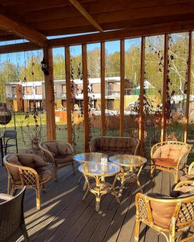 - На террасе столик, кресла, диван