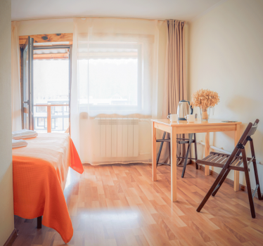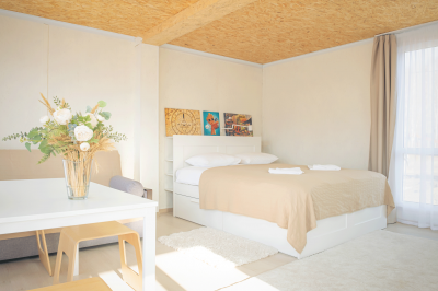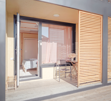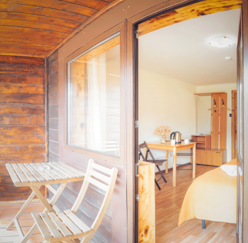 Однокомнатные номера с панорамными окнами/балконом/или террасой. На 1 или 2 этаже.