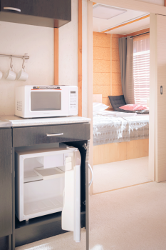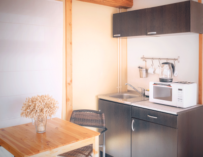 - Кухонный уголок: холодильник, свч-печь, чайник, посуда, чай, питьевая вода, (мультиварка по запросу).