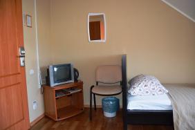 Односпальная кровать, шкаф, стол, телевизор, телефон, чайник. Душ, WC, раковина — на этаже.