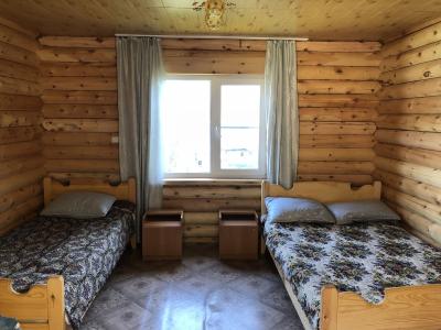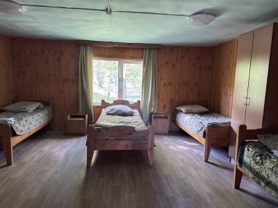 Первый этаж 7 мест 9500 р. 3 комнаты с общей кухней и печкой. В двух комнатах по 2 односпальные кровати. В третьей комнате одна двуспальная и одна односпальная кровати. Во всех комнатах индивидуальные тумбочки. А также на первом этаже имеется