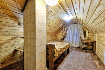 В гостиной лестница, ведущая на второй этаж. Из коридора на втором этаже вход в три отдельных номера.