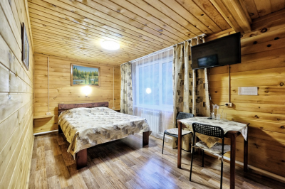 В номере: 2 основных места - двуспальная кровать, шкаф, телевизор, журнальный столик. Санузел совмещенный, душевая кабина.