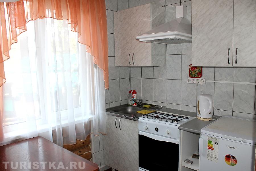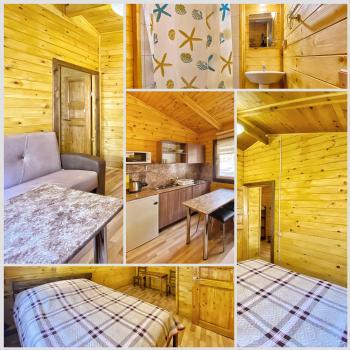 В нем оборудована кухня гостиная со всей необходимой посудой, холодильник, чайник, микроволновка, газовая плита, стол обеденный и диван книжка раскладывается, шкаф, телевизор. Санузел, душ, фен. И спальня с двуспальной кроватью, шкаф и стол между комнатами дверь.