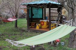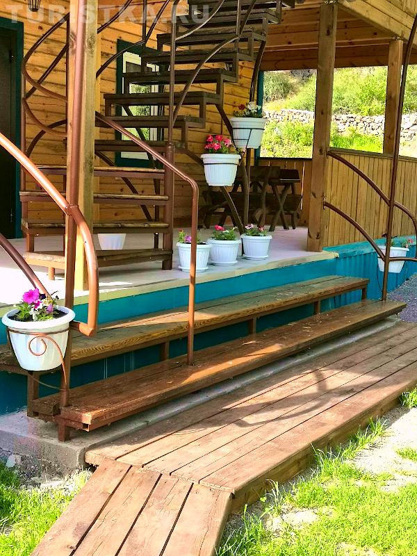 - На втором этаже — номер 3,4 общим балконом и прекрасным видом на горы. Около домика верандочка со столиком.