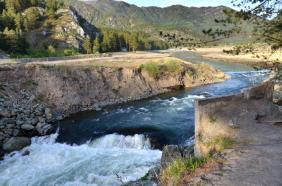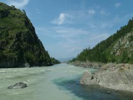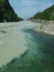 Воды двух рек какое-то время текут отдельными полосами до узкого прохода в скалах ущелья, называемого "Ворота Сартакпая" по имени богатыря героя алтайского эпоса.