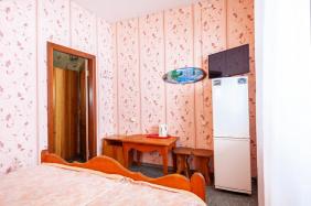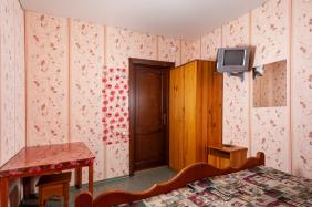 В номере: двуспальная кровать и полутороспальная кровать, шифоньер, прикроватная тумбочка, журнальный столик, табуретки, ТВ, холодильник, эл.чайник.