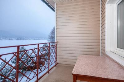 В номере: двуспальная кровать, ТВ, холодильник, чайник, посуда, лоджия, шифоньер, прикроватная тумбочка, журнальный столик, табуретки. Лоджия с видом на озеро.