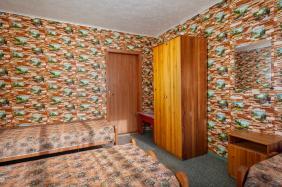 В номере: четыре полутороспальные кровати, шифоньер, прикроватная тумбочка, журнальный столик, табуретки.