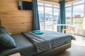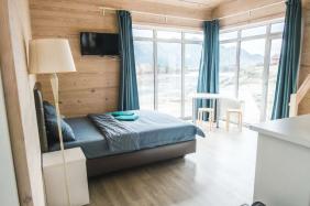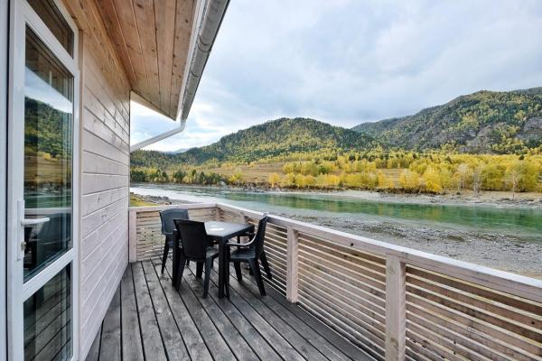 Делюкс: они отличаются современным дизайном, отделкой натуральными материалами и замечательным видом на Катунь из панорамных окон. В каждом номере Делюкс есть небольшая кухня, холодильник, и все необходимое для комфортного отдыха. Дополнительные места расположены на антресолях, некоторые номера имеют выход на открытые террасы. Такие номера вмещают от двух до четырех человек.