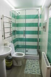 - Однокомнатый Стандарт для комфортного размещения двух человек большая кровать с удобным матрасом, горячая/холодная вода, душевая кабина, раковина, унитаз, ТВ, чайник, холодильник, фен, полотенца.