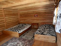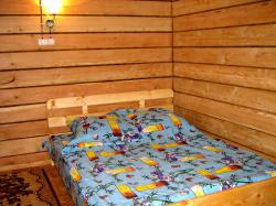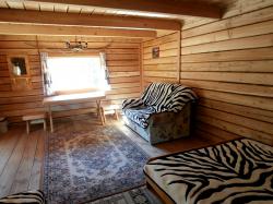 В домиках имеется двуспальная кровать (постельное белье в наличии), кресло-кровать, место для одежды, стол, стулья, электрообогреватель.