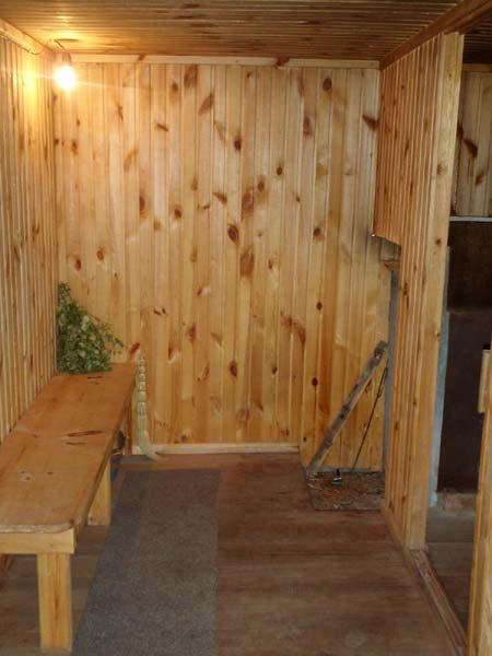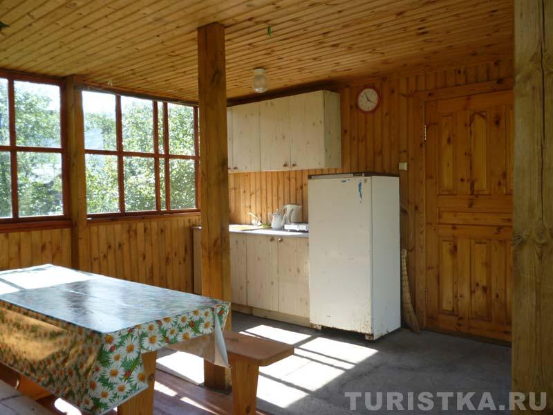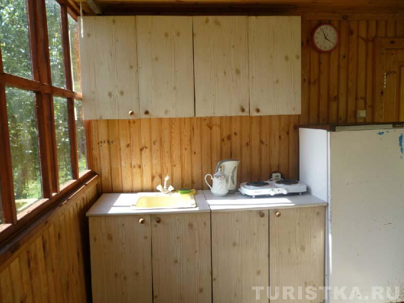 Готовят гости на застекленной кухне первого этажа, где проведена холодная вода, есть холодильник. Помыться и попариться можно в бане, в которой есть небольшая комната для отдыха, а парилка и моечная совмещены в одном помещении. Душ находится здесь же. Подышать воздухом и охладиться можно на крытой веранде перед баней. На территории усадьбы есть место для мангала и место для парковки машины.