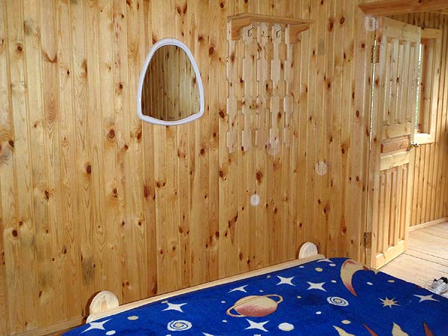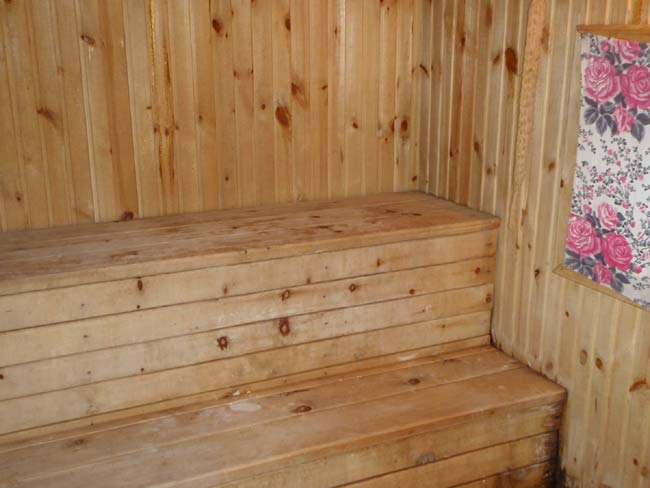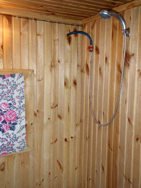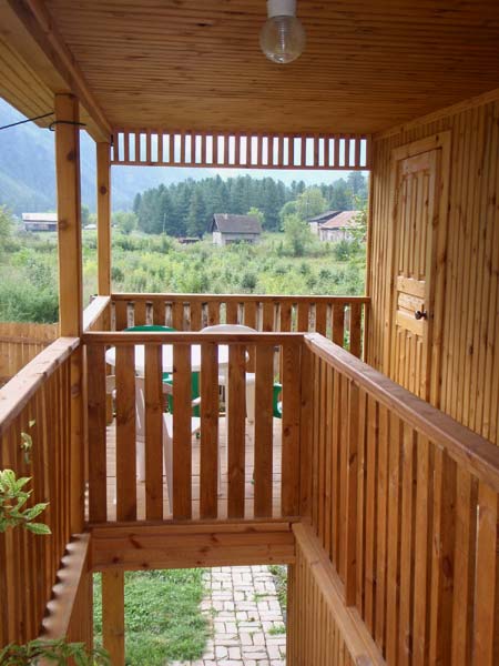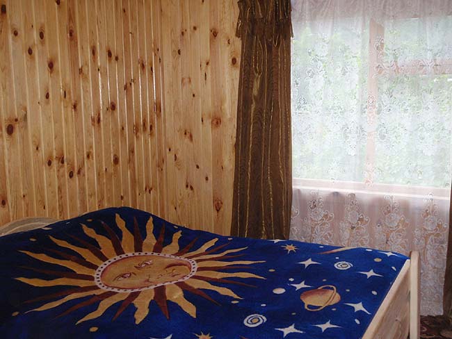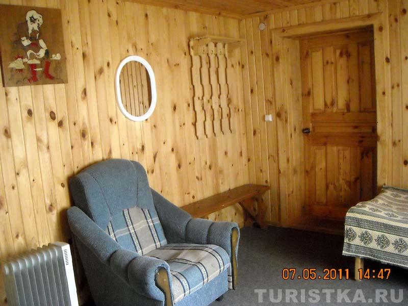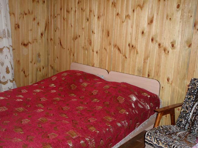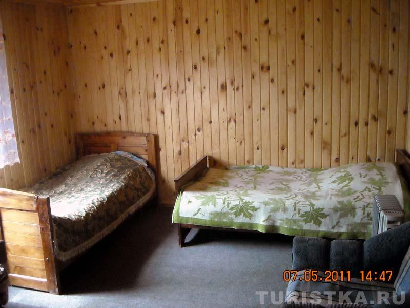 В гостевом доме три комнаты. На первом этаже комната с тремя одноместными кроватями, она рассчитана на проживание до поздней осени (когда холодно сюда ставят обогреватель, переносят умывальник и стол с плиткой). На втором этаже две комнаты с 2-х спальными кроватями. На втором этаже перед комнатами есть балкон, на котором установлены столик и кресла. Умывальник и туалет находятся на улице.