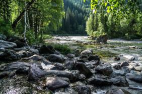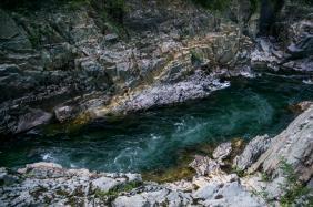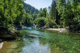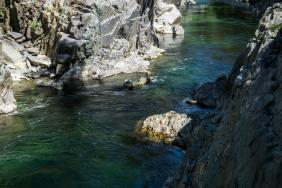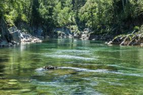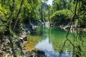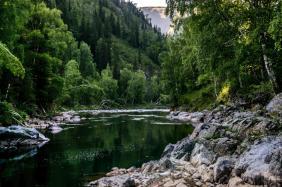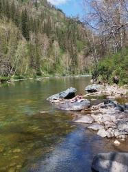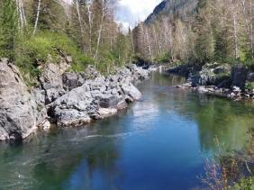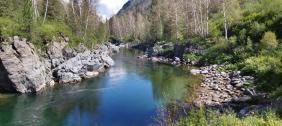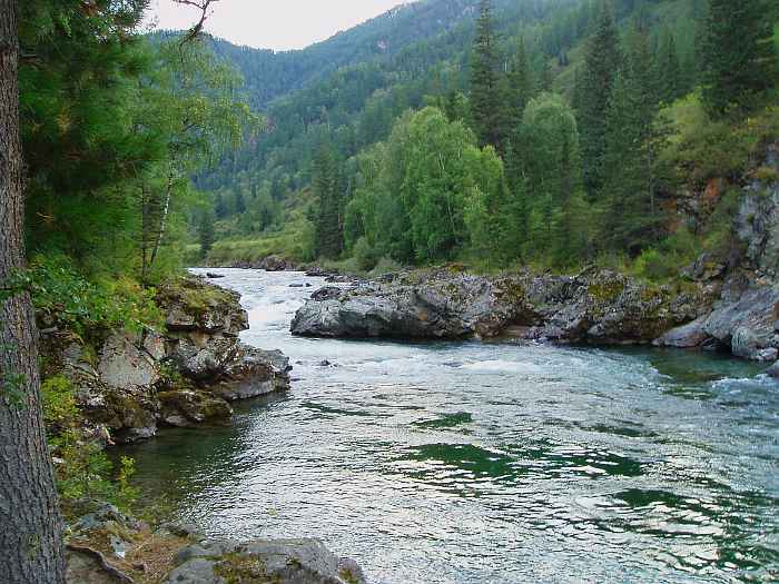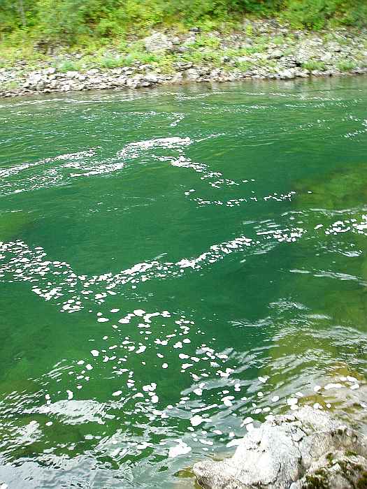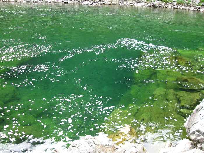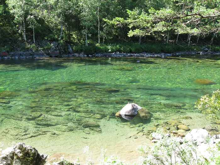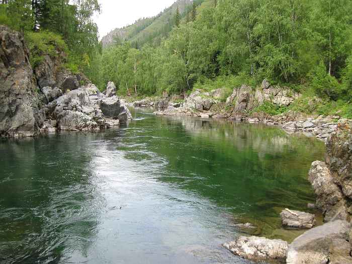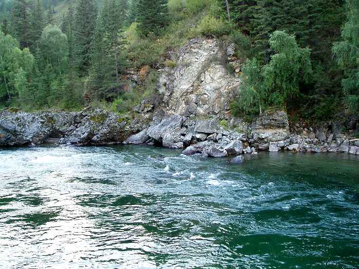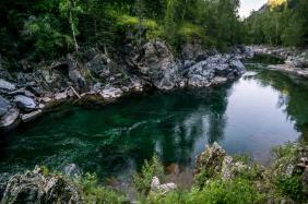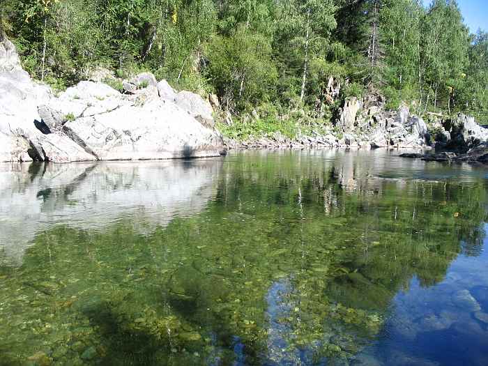 Вода Кумира в районе Девичьих плесов имеет изумительный цвет - от стального до очень темно-изумрудного и светло-изумрудного.