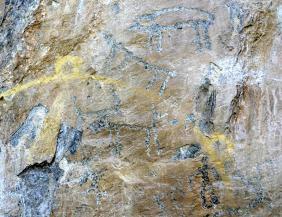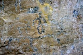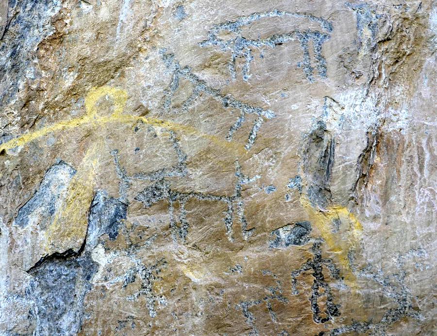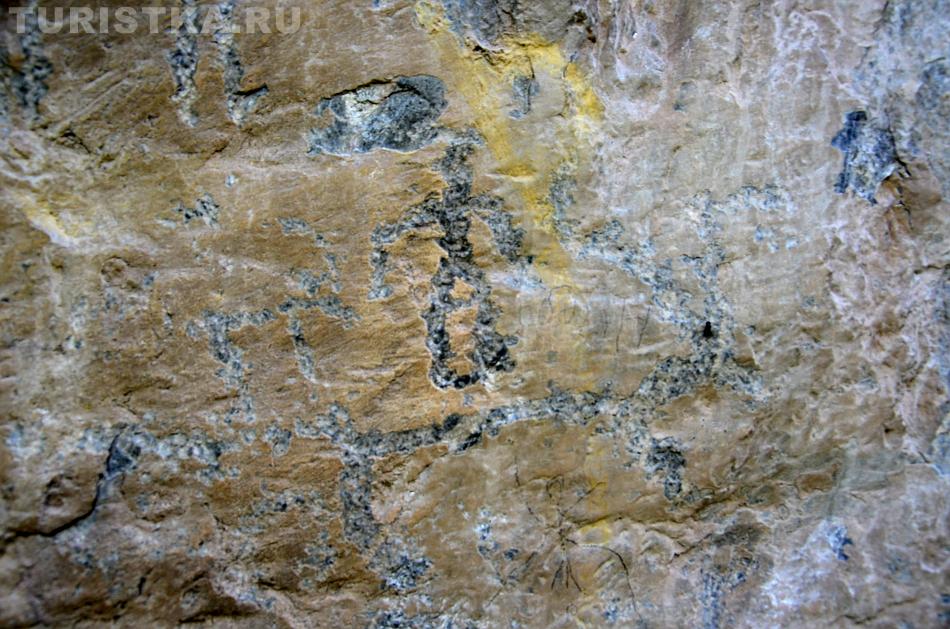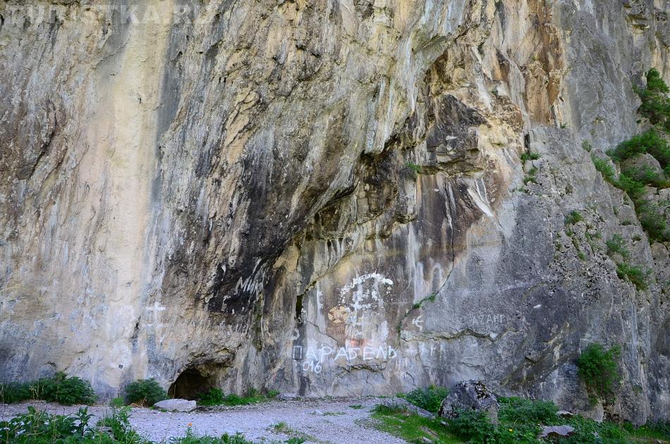 Поднявшись от водопада выше по тропе, вы сможете справа на одной из скал увидеть петроглифы. Петроглифы с тропы, конечно, не видно, ориентируйтесь на пятиконечную звезду красного цвета в желтом круге на скале. Это "современное искусство". Подойдите поближе и внимательно изучите скалу, вы увидите петроглифы, изображающие человека, горных козлов. Основная часть петроглифов относится к эпохе раннего железа (начало 1-го тыс. до н. э)
