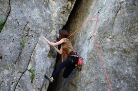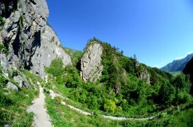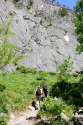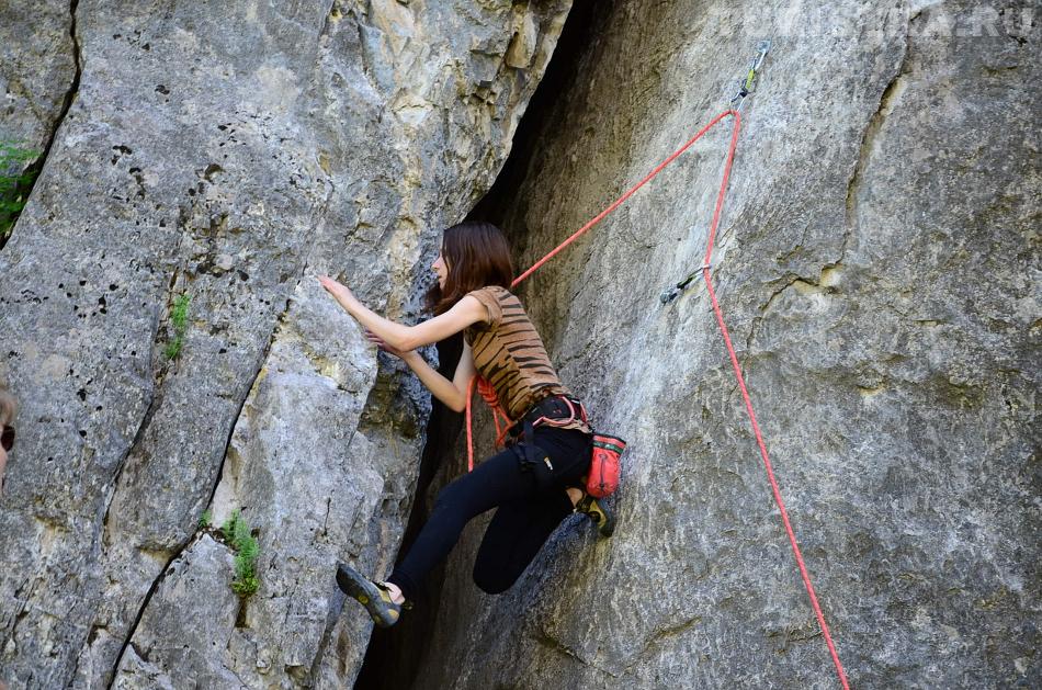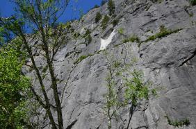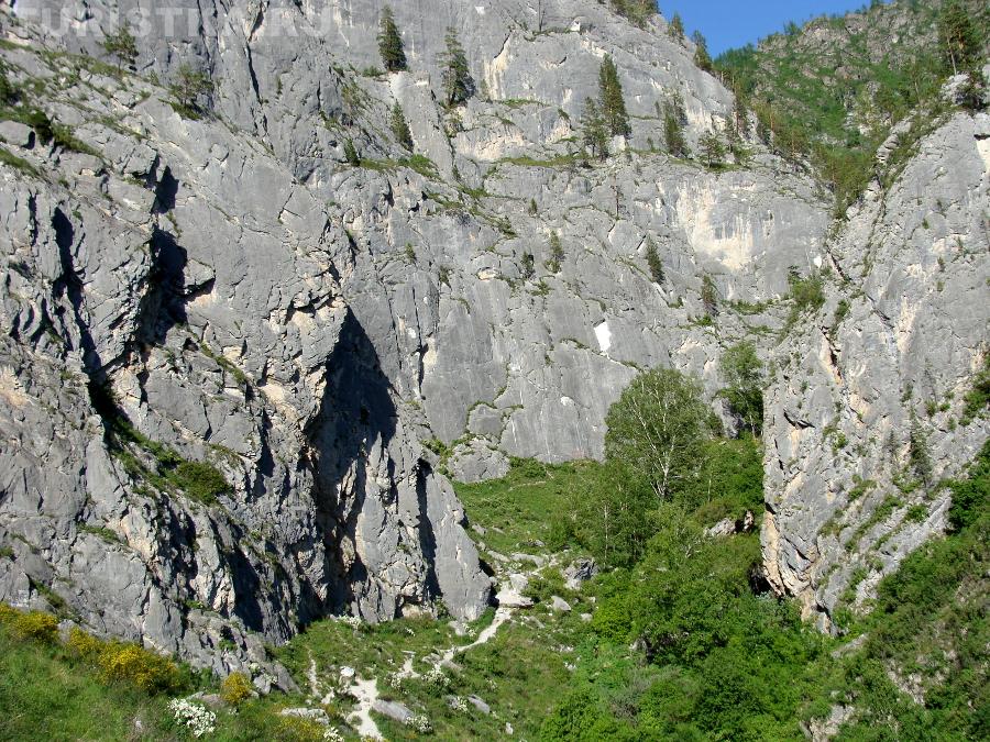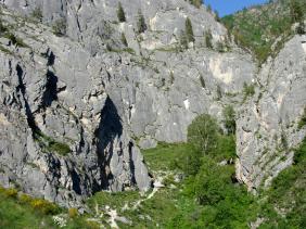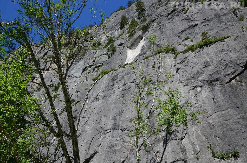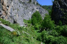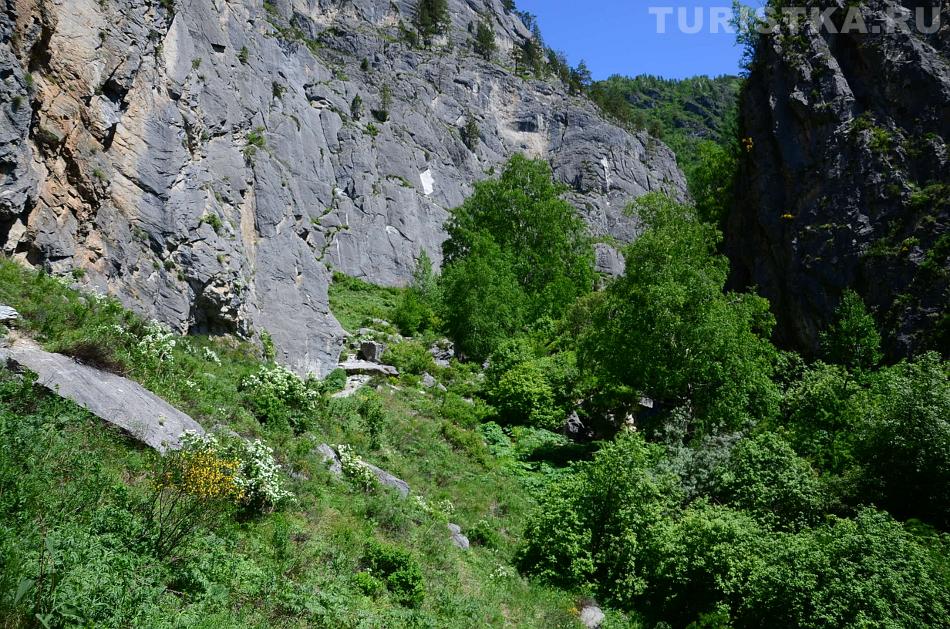 Заросшее зеленью ущелье переходит в отвесные скалы. Здесь часто тренируются скалолазы.