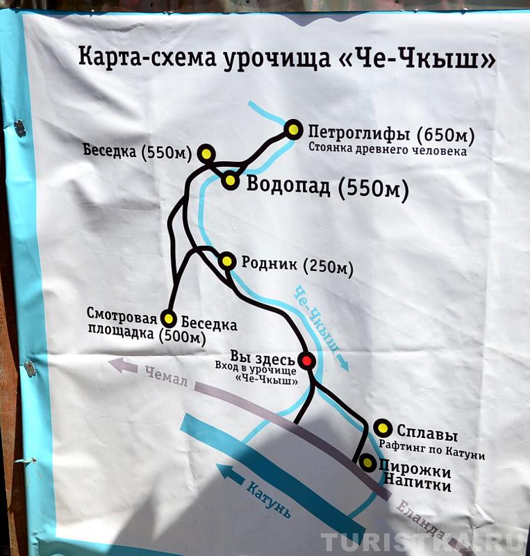 Водопад Чечкыш (Че-Чкыш) и Долина горных духов на карте Алтая