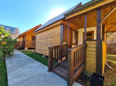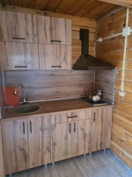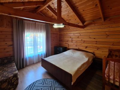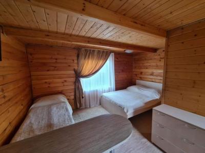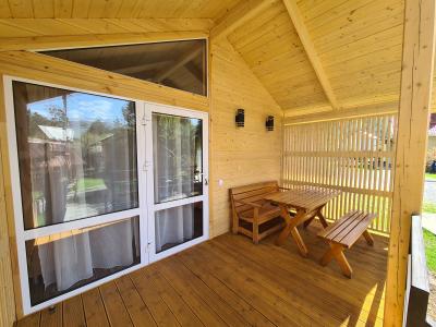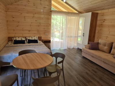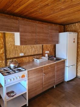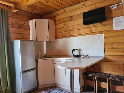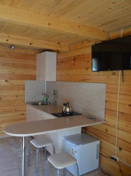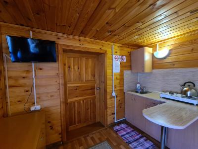 В домике двуспальная и односпальная кровать, кухонная зона со стойкой, газовая плита, холодильник, телевизор, комод.