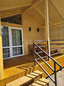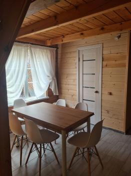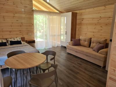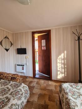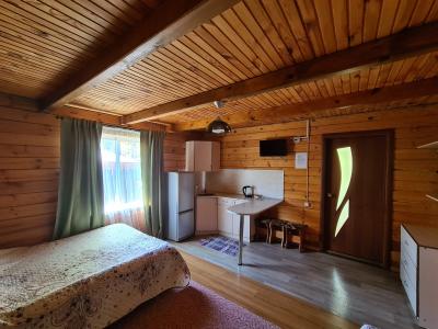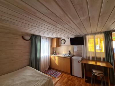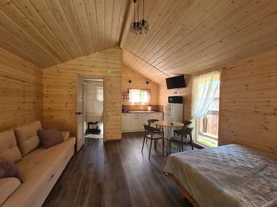 Однокомнатный, просторный, светлый дом студия. Вместимость 2-4 человека.В домике двуспальная кровать, диван на два человека, кухня оборудована для приготовления, микроволновая печь, холодильник, телевизор, тумбочка.