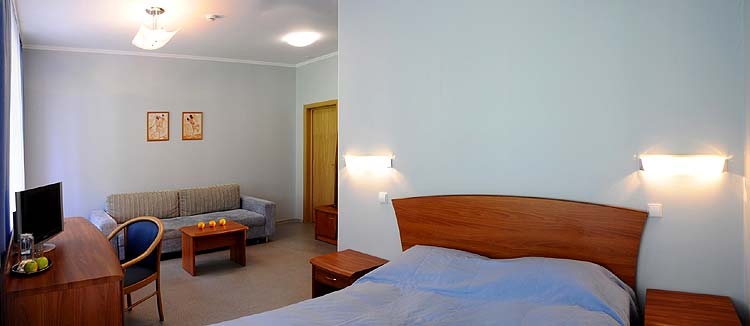 Трёхразовое по заказному меню, включено в стоимость путевки. Есть отдельные диет-зал и Люкс-зал. В каждом зале накрывается дополнительный салат-бар с холодными закусками, овощами и разнообразными салатами. Дополнительно предлагаются различные соки, нектары и напитки собственного производства (напитки из шиповника, кисели, морсы из клюквы и брусники, компоты и т.д.).