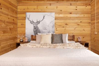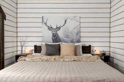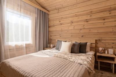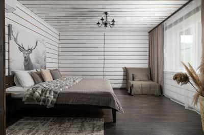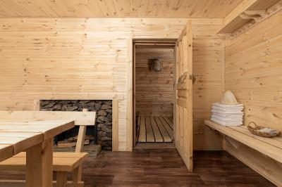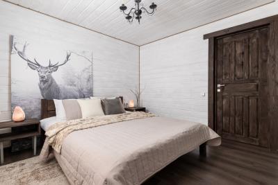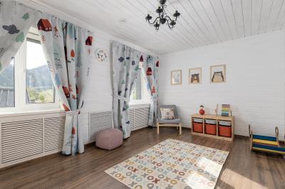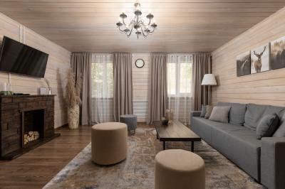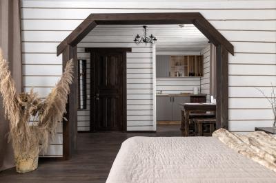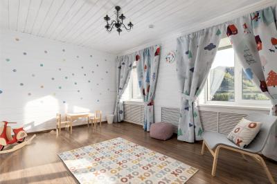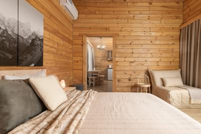 Вместимость: 6 основных мест, 2 дополнительных. Отдельно стоящий деревянный домик с тремя комнатами, залом, детской игровой комнатой, кухней. Спальная комната: двуспальная кровать, прикроватные тумбы. Туалетная комната в каждом номере: wc, раковина для умывания, душевая кабина, набор полотенец, индивидуальный гигиенический набор, фен, халат. Зал с раскладным диваном и телевизором. Кухня: стол со стульями, плита, холодильник, чайник, микроволновая печь, набор посуды.