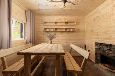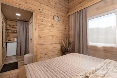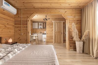 Вместимость: 2 основных места. Отдельно стоящий деревянный домик с террасой. Спальная комната: двуспальная кровать, прикроватные тумбы. В номере есть холодильник и чайник, набор посуды. Туалетная комната: wc, раковина для умывания, душевая кабина, набор полотенец, индивидуальный гигиенический набор, фен, халат.