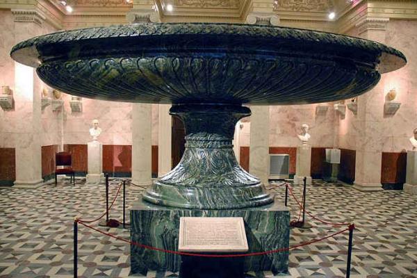 В 1819 г в Ревневской каменоломне был найден монолитный одиннадцати-метровый участок породы. После того, как отделили монолит и отколовшийся затем кусок камня, осталась пригодная для обработки глыба в 5,6 м. Кабинетом Александра I предписано было изготовить из этой глыбы элипсовидную чашу. Усилиями более пяти ста человек камень переправили на Колыванскую шлифовальную фабрику, где около одиннадцати лет выдалбливалась и отполировывалась емкость чаши, наносился орнамент. Камень для пьедестала вазы нужен был без внутреннего изъяна, нашли его не сразу. После того, как чаша и пьедестал были готовы их погрузили на специальные сани, запряженные 154 лошадьми и довезли до пристани на Уральской реки Часовой. Затем по реке на барже переправили до Петербурга. В 1849 г. ваза была установлена в проезде нового здания Эрмитажа, т.к. ваза не проходила в дверной проем ни одной залы. Через некоторое время проезд загородили стенами и гигантская ваза нашла свое пристанище. У "Царицы ваз" не зря такое название – это самая большая ваза в мире. Высота ее с пьедесталом равна 257 см, большой диаметр равен 504 см, меньший диаметр равен 322 см. Вес гигантской вазы равен 19 тонн.
