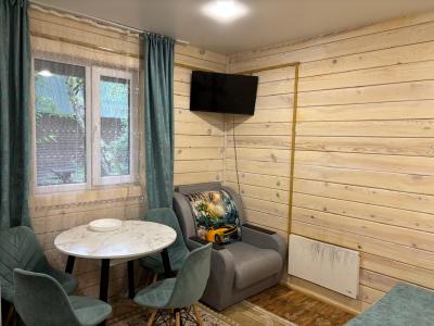 I этаж: две 1-спальных кровати, кресло-кровать, стол, стулья, пенал для белья, Wi-Fi, TV, тумбочка. Мини кухня с посудой, холодильник, микроволновка, чайник. Инфракрасный обогреватель. Туалетная комната: WC, раковина, душевая кабина, фен.