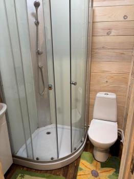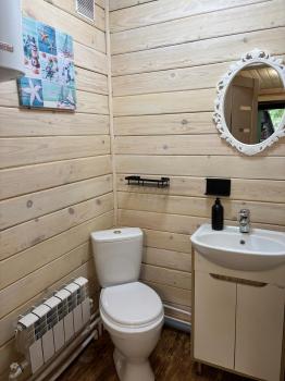 - Первый этаж: две спальни, гостиная, санузел. В спальнях: 1 двуспальная кровать и по 2 односпальных кровати, тумбочки, столик, два пуфика. В гостиной: спутниковое TV, шкаф-прихожая, обеденный стол, кухонный уголок, мини кухня, четыре стула, холодильник, микроволновка, чайник, набор посуды. Водяное отопление и теплые полы. Туалетная комната: WC, раковина, душ (горячая, холодная вода).
